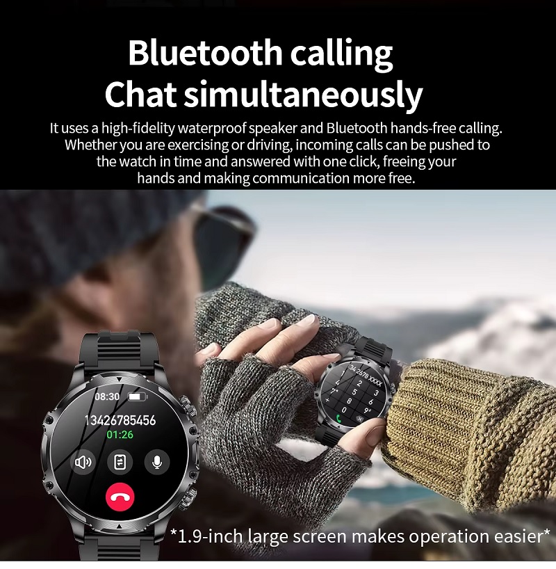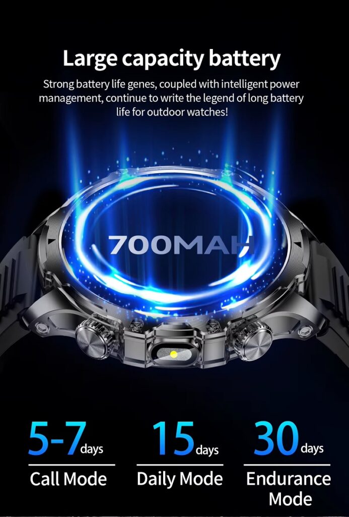 This is AK75 Military grade Smartwatch, a budget-friendly, ruggedized Bluetooth calling smartwatch featuring a 1.9-inch display, a large 700mAh battery (offering 5-10 days usage), and an integrated LED flashlight. Designed for outdoor sports, it includes IP67 waterproofing, 100+ sport modes, and comprehensive health monitoring (heart rate, blood pressure, oxygen, sleep) for Android and iOS.